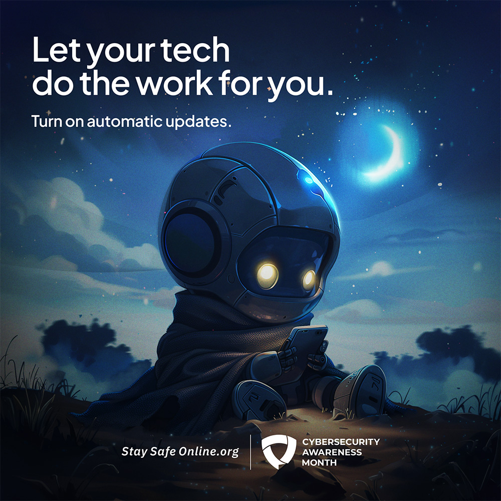 Automatic updates? Yes, please. Let your tech do the work for you by turning on automatic updates, ensuring you have the latest and greatest software. Your fridge? Doorbell? Lightbulb? Dog collar? If it’s connected to your Wi-Fi, make sure it’s up to date! The latest software updates provide the best security, no matter what device. #CybersecurityAwarenessMonth